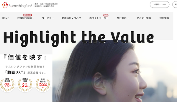 サムシングファン株式会社は、大阪、東京、名古屋に拠点を持つ動画制作・映像制作会社で、年間7,000本以上の映像制作実績を誇ります。「価値を映す」をテーマに、動画DX®の提案を行い、企業のブランディングやマーケティングを支援しています。豊富な経験と技術力を活かし、顧客のニーズに応じたオリジナル映像コンテンツを提供します。