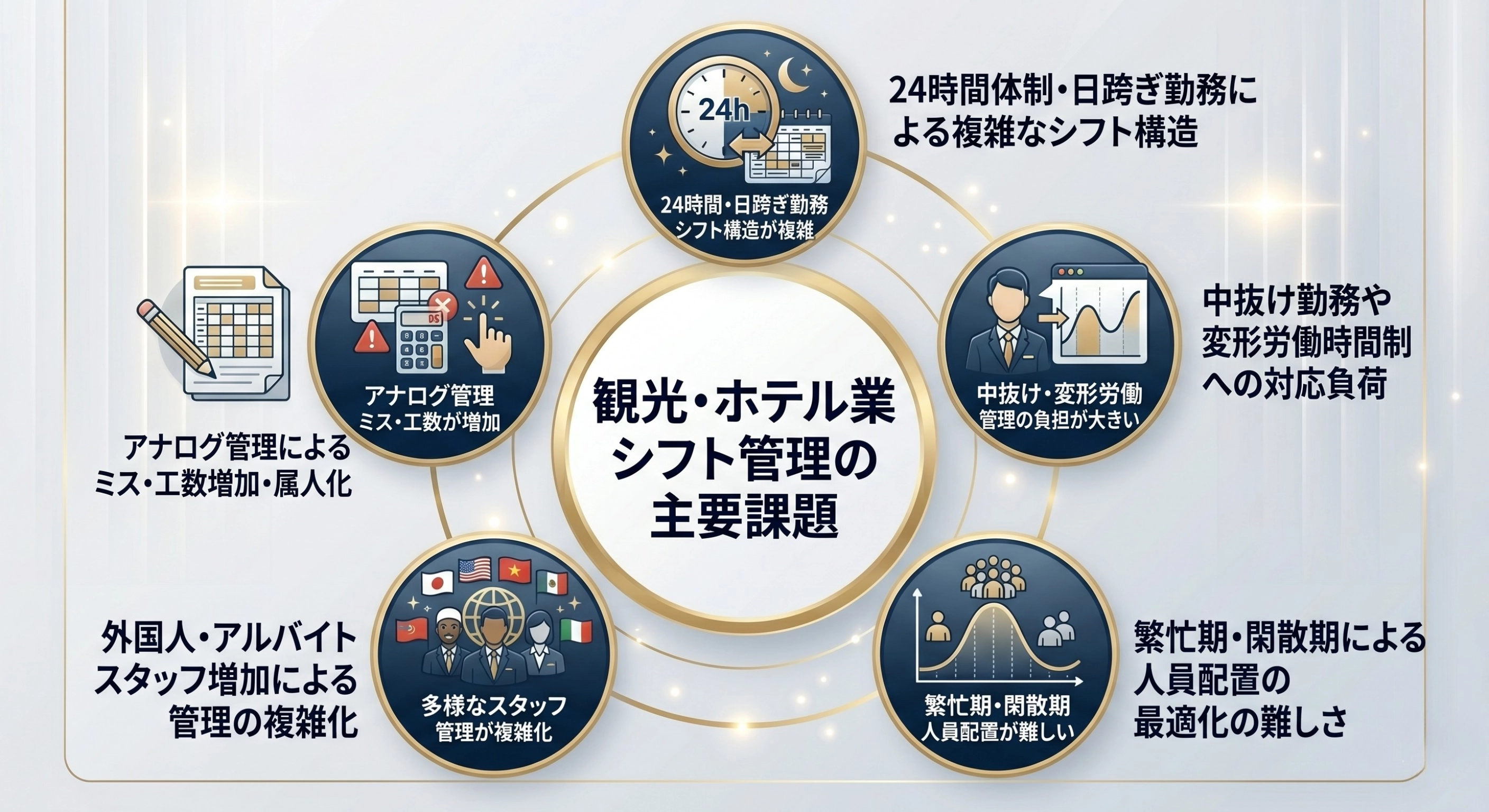 - 繁忙期と閑散期で人員配置の最適化ができていない